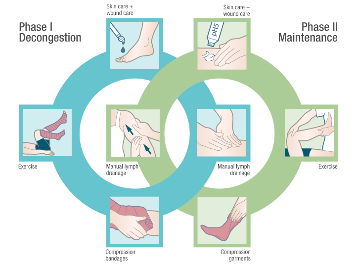 Complete Decongestive Therapy is a combination of MLD, compression bandaging, remedial exercises and skin/nail care. CDT is divided into two treatment phases. Intensive phase which is then followed with the maintenance phase. Intensive phase usually takes between 2-4 weeks, maintenance phase is usually continued indefinitely.