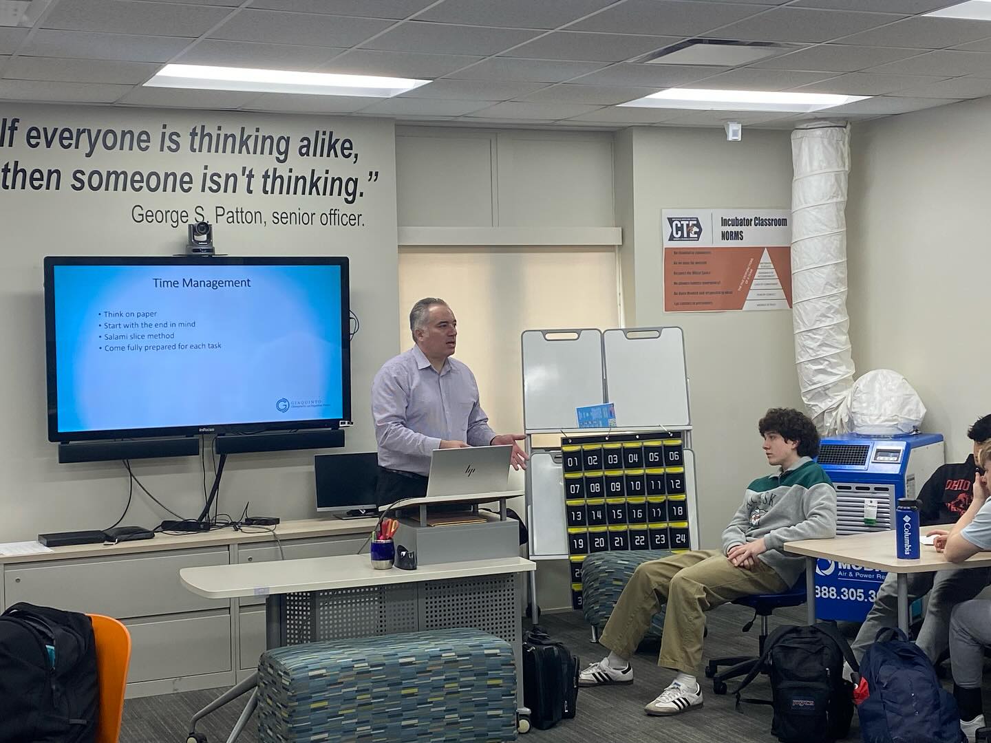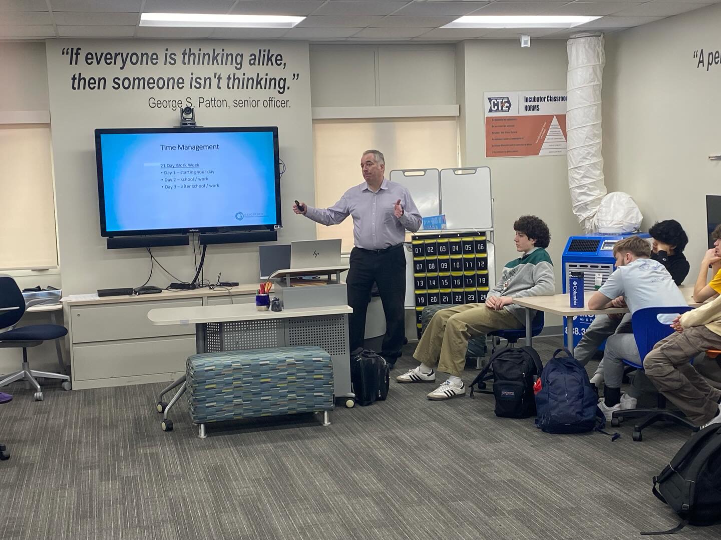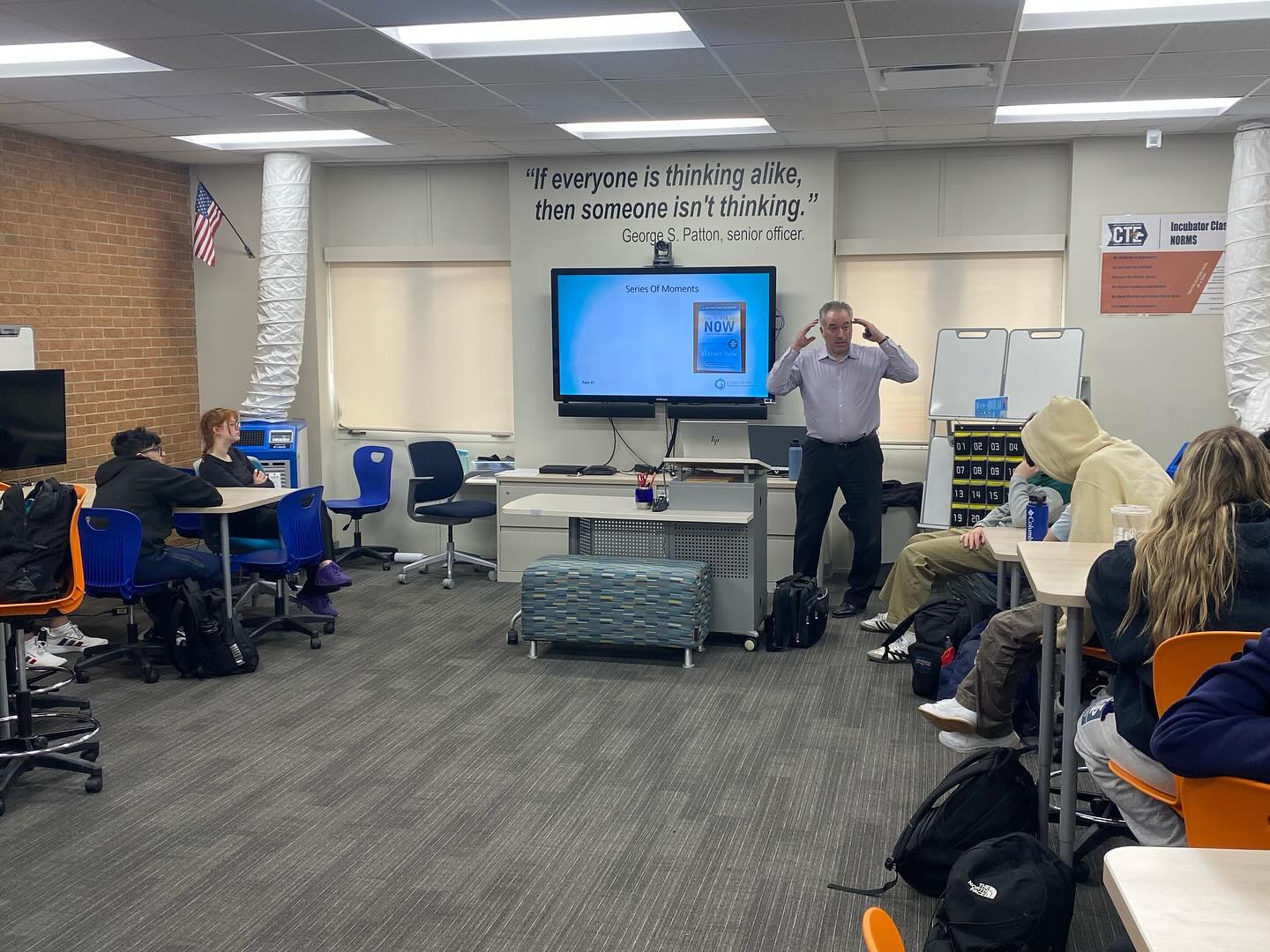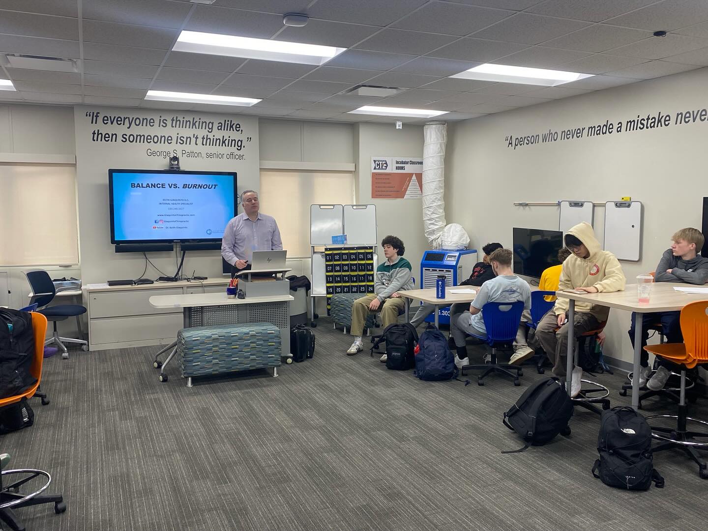On that page, upload the attached photos under the text "Dr. Keith was at Naperville North High School this morning giving his Balance VS. Burnout lecture to all 4 of the INCubator classes. Dr. Keith deepened their understanding of how the body works and the importance of self-care.